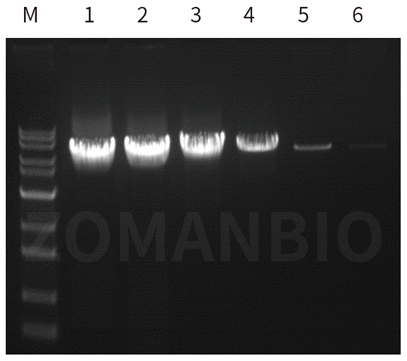 M:DL15000 plus DNA marker 1:500ng 2:50ng 3:5ng 4:0.5ng 5:50pg 6:5pg |