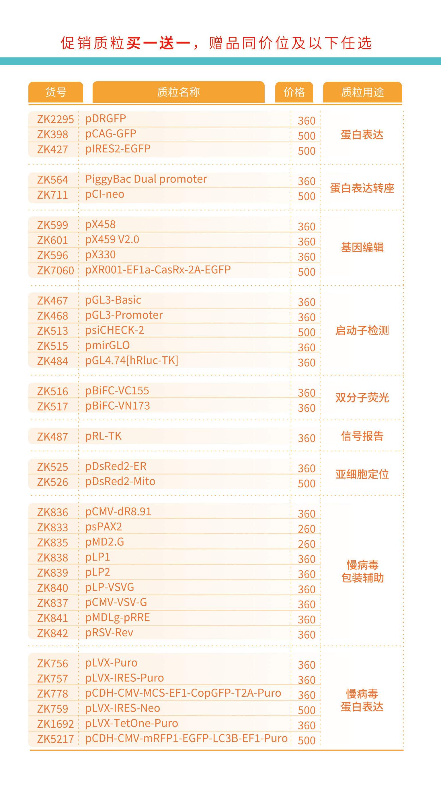 本次促销覆盖蛋白表达、克隆载体、基因编辑、启动子检测、亚细胞定位等数十种实验载体,适配大肠杆菌、哺乳细胞、酵母、植物等多种研究体系: