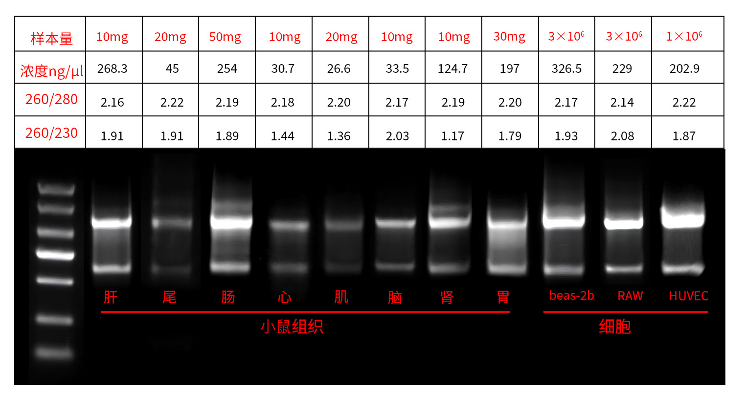 注:使用ZP441对不同小鼠组织、细胞样本提取的RNA进行琼脂糖凝胶电泳检测。M:Maker DL2000 洗脱体积:50ul 上样量:2ul。