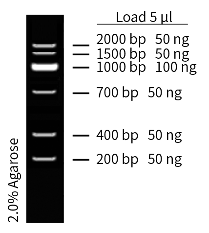 本产品是由6条线性双链DNA条带组成,适用于琼脂糖凝胶电泳中DNA条带的分析。产品中已含有1×loading buffer,可根据实验需要,直接取2-5μl电泳,使用方便,电泳图像清晰。6条带的大小分别为200,400,700,1000,1500,2000bp。其中1000bp条带约为100ng/5μl,显示加亮带,其余条带浓度约为50ng/5μl。