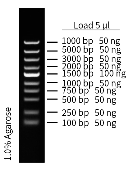 本产品是由10条线性双链DNA条带组成,适用于琼脂糖凝胶电泳中DNA条带的分析。产品中已含有1×loading buffer,可根据实验需要,直接取2-5μl电泳,使用方便,电泳图像清晰。10条带的大小分别为100,,250,500, 750, 1000,1500,2000,3000,5000,10000bp。其中1500bp条带约为100ng/5μl,显示加亮带,其余条带浓度约为50ng/5μl。