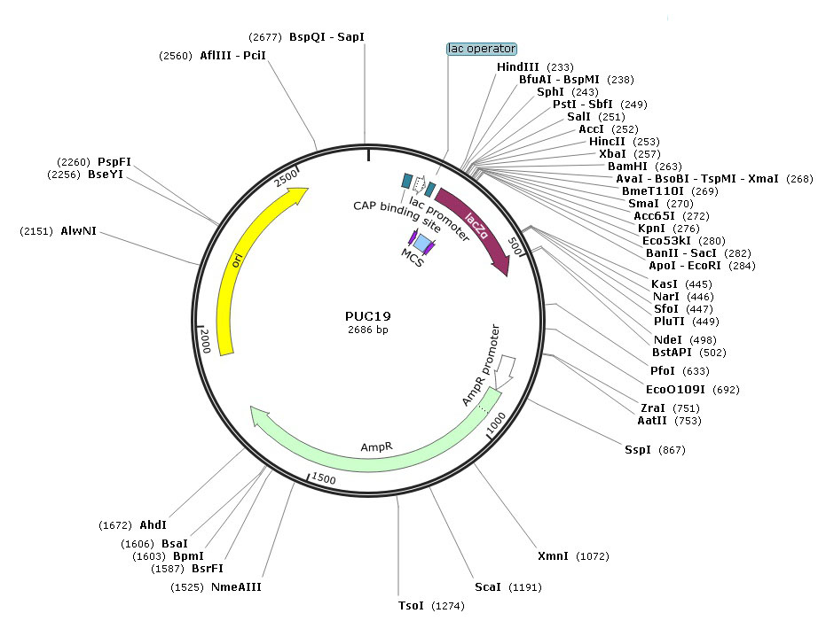 pUC18 和 pUC19 大小只有 2686bp ,是最常用的质粒载体,其结构组成紧凑,几乎不含多余的 DNA片段,GenBank注册号为 L08752(pUC18)和 X02514(pUC19)。由 pBR322 改造而来,其中 lacZ (MSC)来自 M13mp18/19 。这两个质粒的结构几乎是完全一样的,只是多克隆位点的排列方向相反。这些质粒缺乏控制拷贝数的 rop 基因,因此其拷贝数达 500-700 。 pUC 系列载体含有一段 lacZ 蛋白氨基末端的部分编码序列,在特定的受体细胞中可表现 α-互补作用。因此在多克隆位点中插入了外源片段后,可通过 α-互补作用形成的蓝色和白色菌落筛选重组 质粒。pUC18、pUC19载体适合于DNA片段的克隆、进行DNA测序、对外源基因进行表达等。由于在lacZ领域中含有多克隆位点,因此在以lacZ缺欠细胞作为宿主 (如:JM109等) 进行转化后,在含有IPTG、X-Gal 的平板培养基上进行培养时,可以很容易地通过蓝白筛选,判断载体中有无DNA片段的插入。同时还可以通过载体上的lac promoter表达外源基因,对插入载体中的DNA片段进行测序等。进行DNA测序时,可以方便地使用M13系列的通用引物。