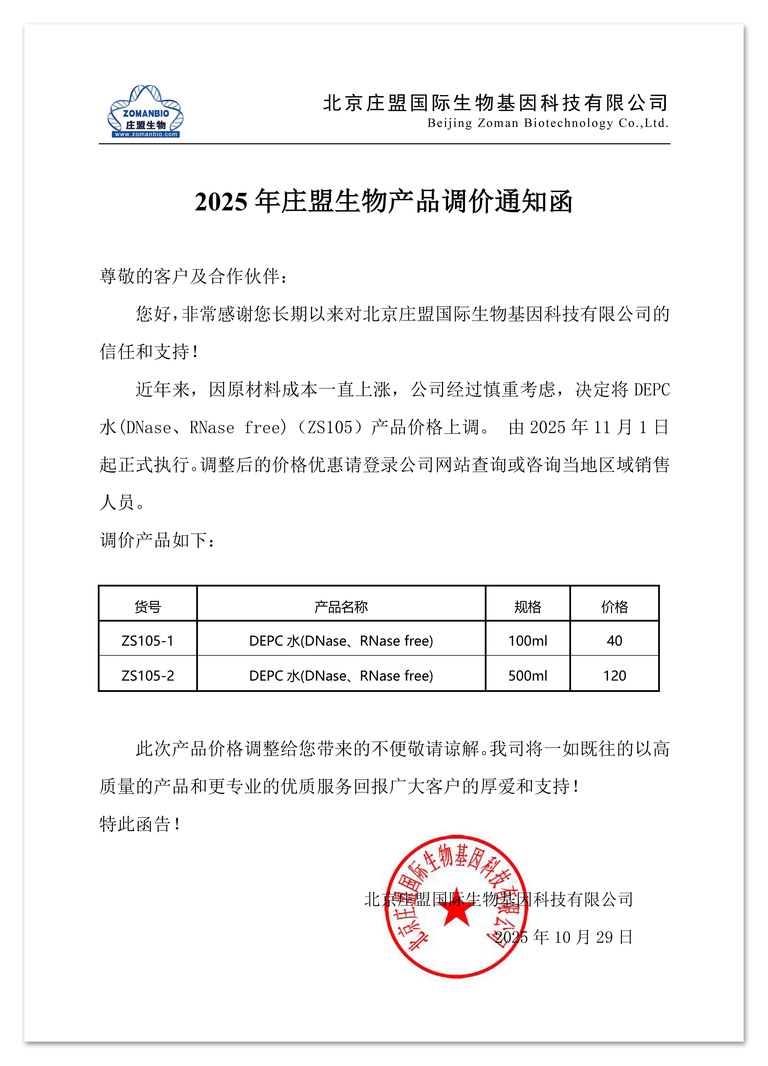 2025 年庄盟生物产品调价通知函
