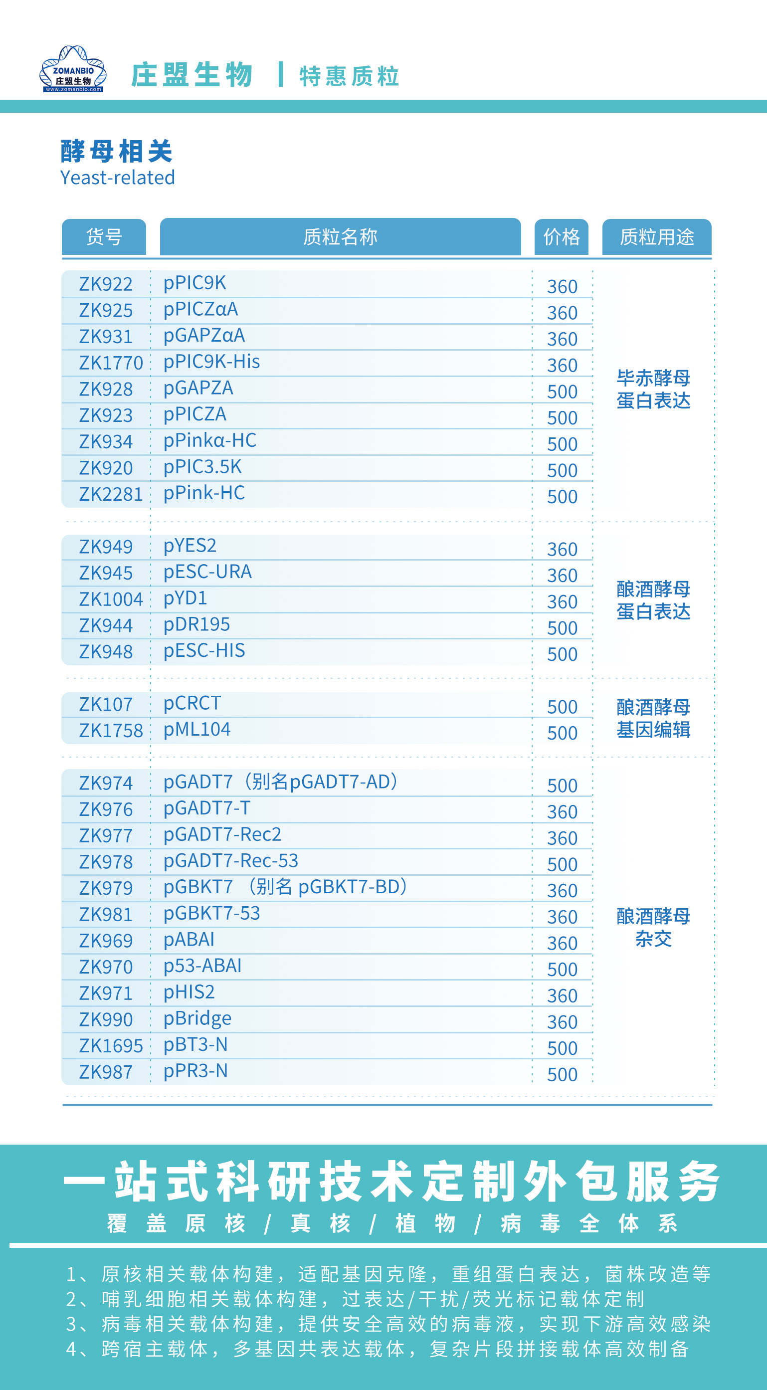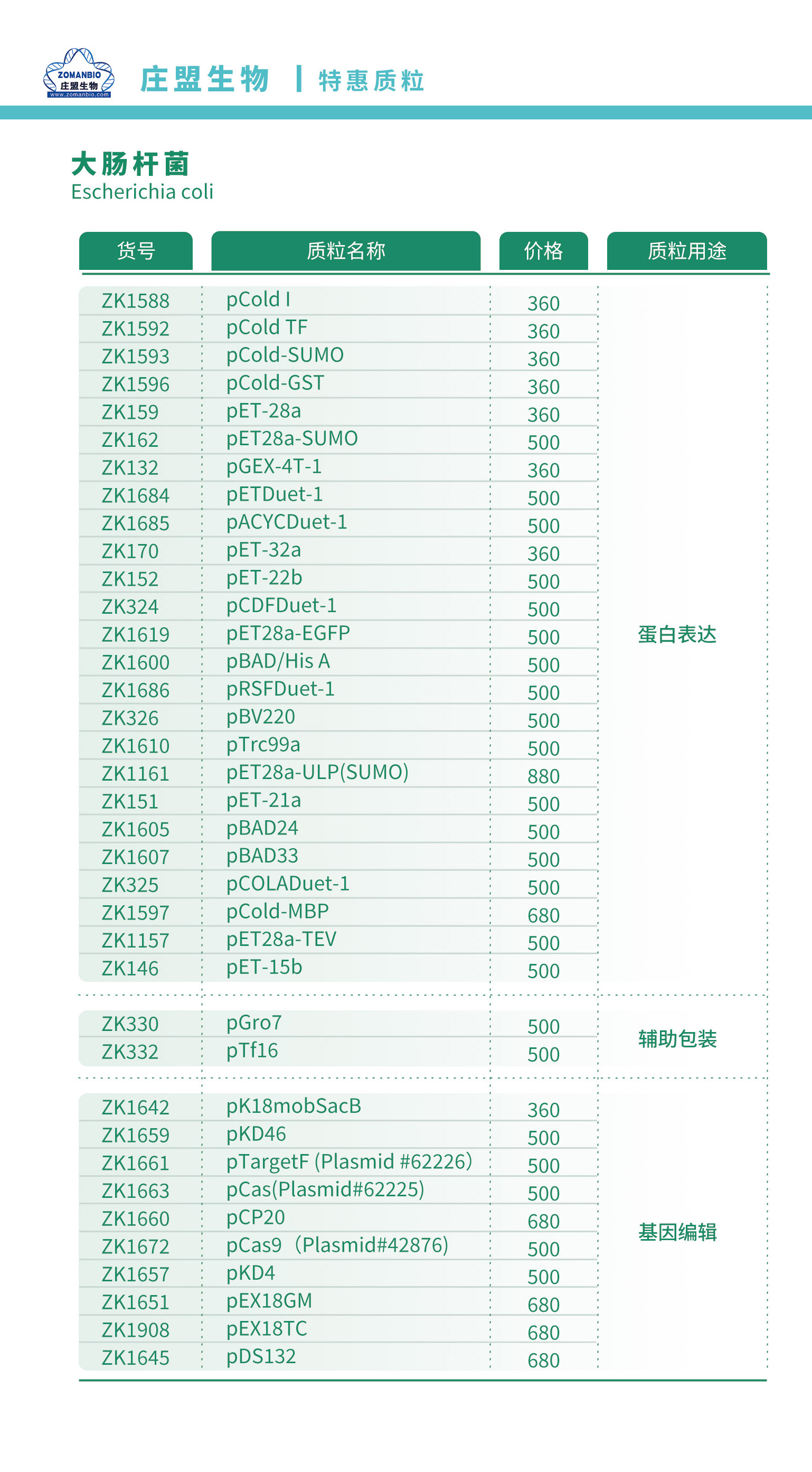 (具体质粒货号、价格及用途可参考文末附表,或登录庄盟生物官网查看详情)