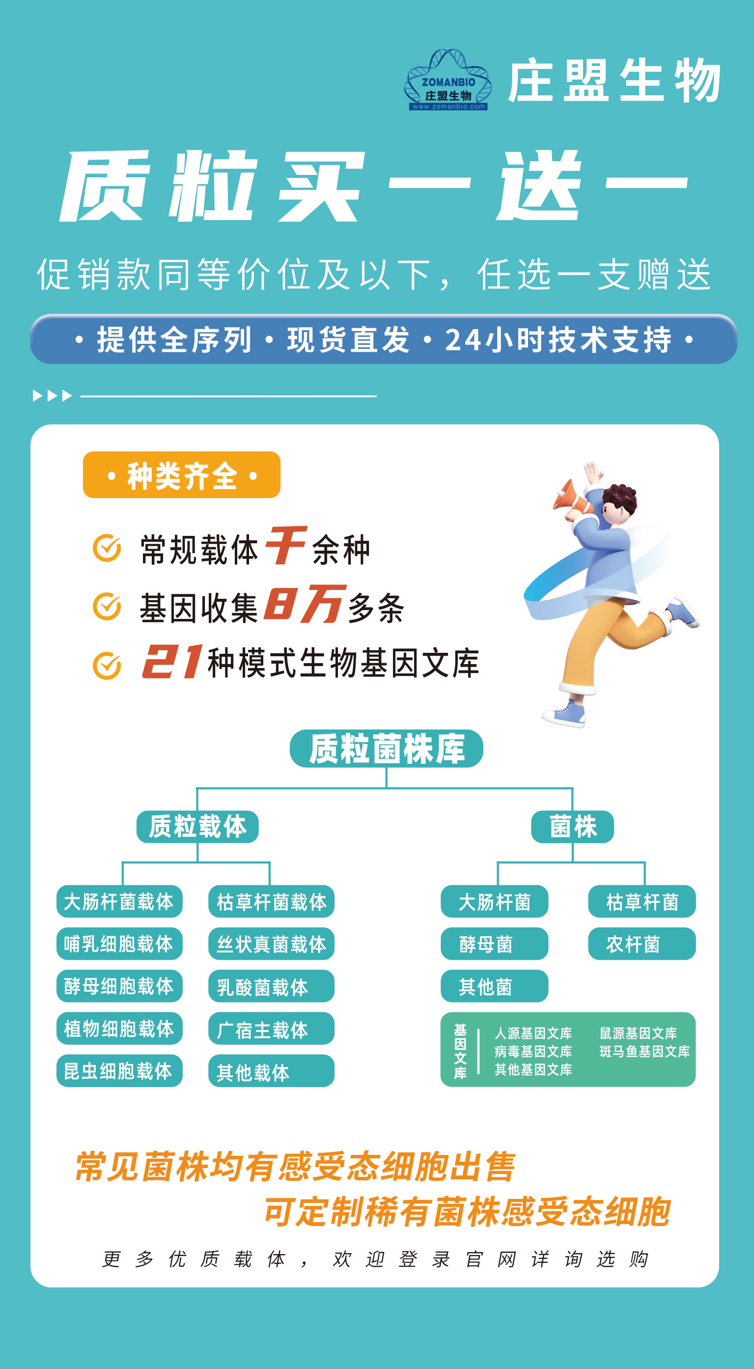 各位科研同仁,福利来啦!庄盟生物特推出质粒 买一送一 重磅促销活动,涵盖大肠杆菌、哺乳细胞、酵母、植物等多类模式生物专用质粒,品类超全、现货直发,还能享受 24 小时技术支持,助力你的实验研究高效推进!