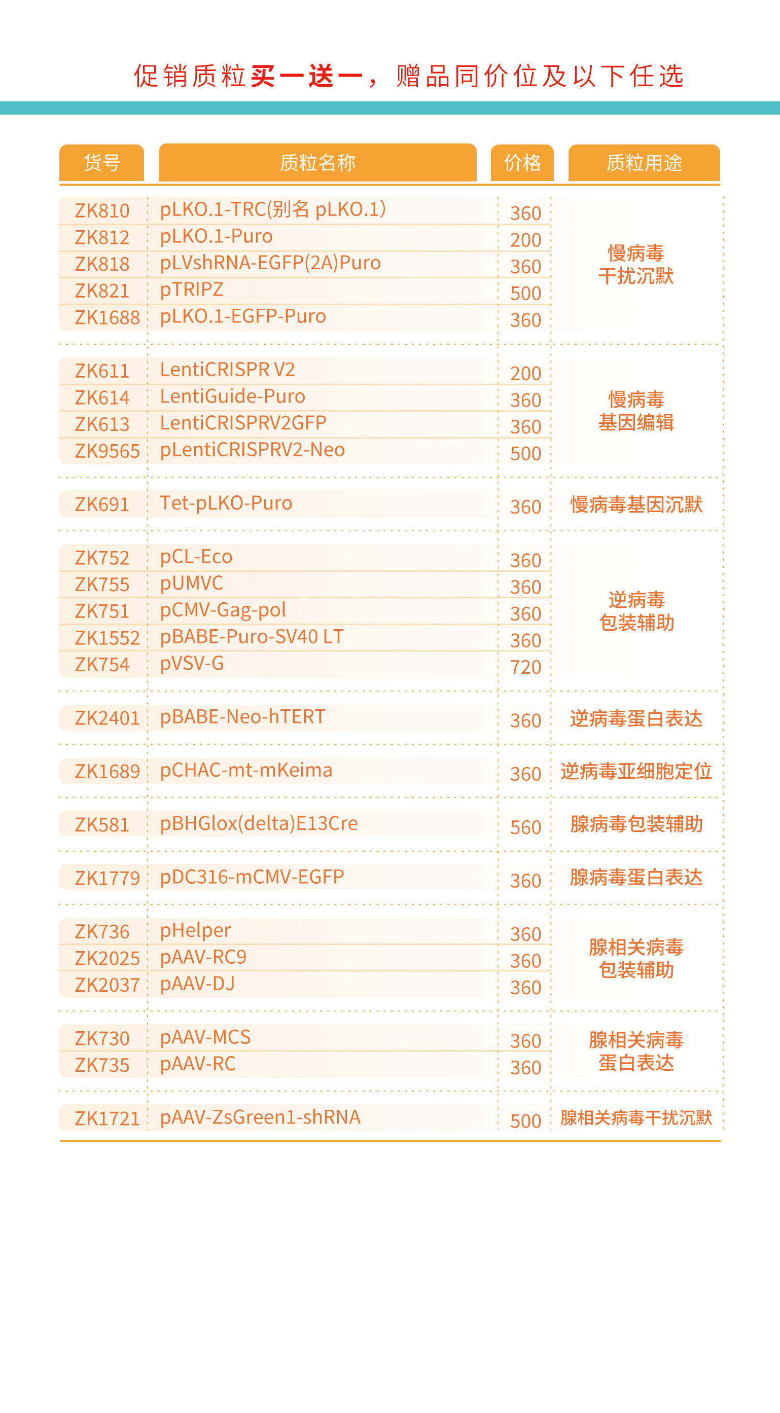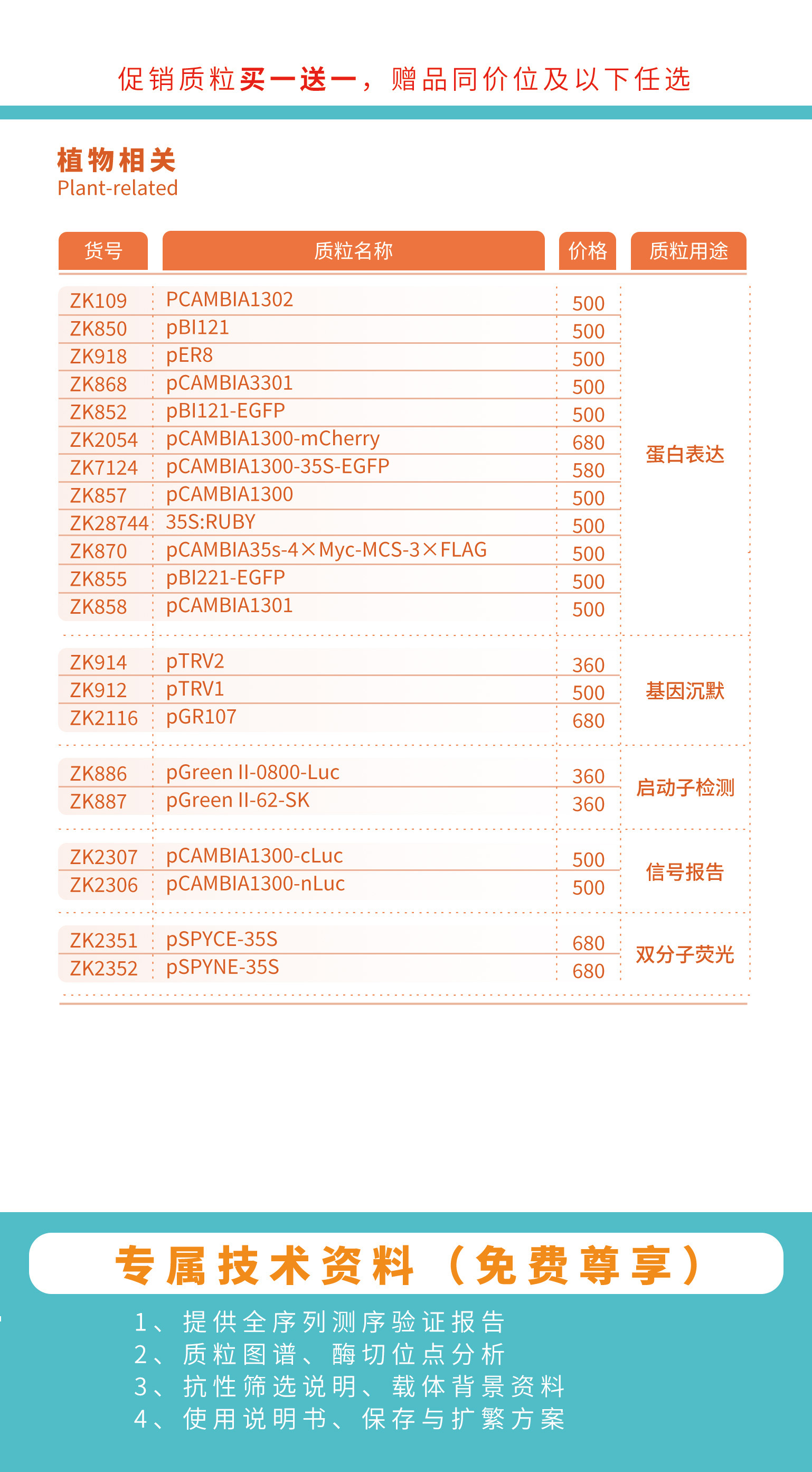 本次促销覆盖蛋白表达、克隆载体、基因编辑、启动子检测、亚细胞定位等数十种实验载体,适配大肠杆菌、哺乳细胞、酵母、植物等多种研究体系: