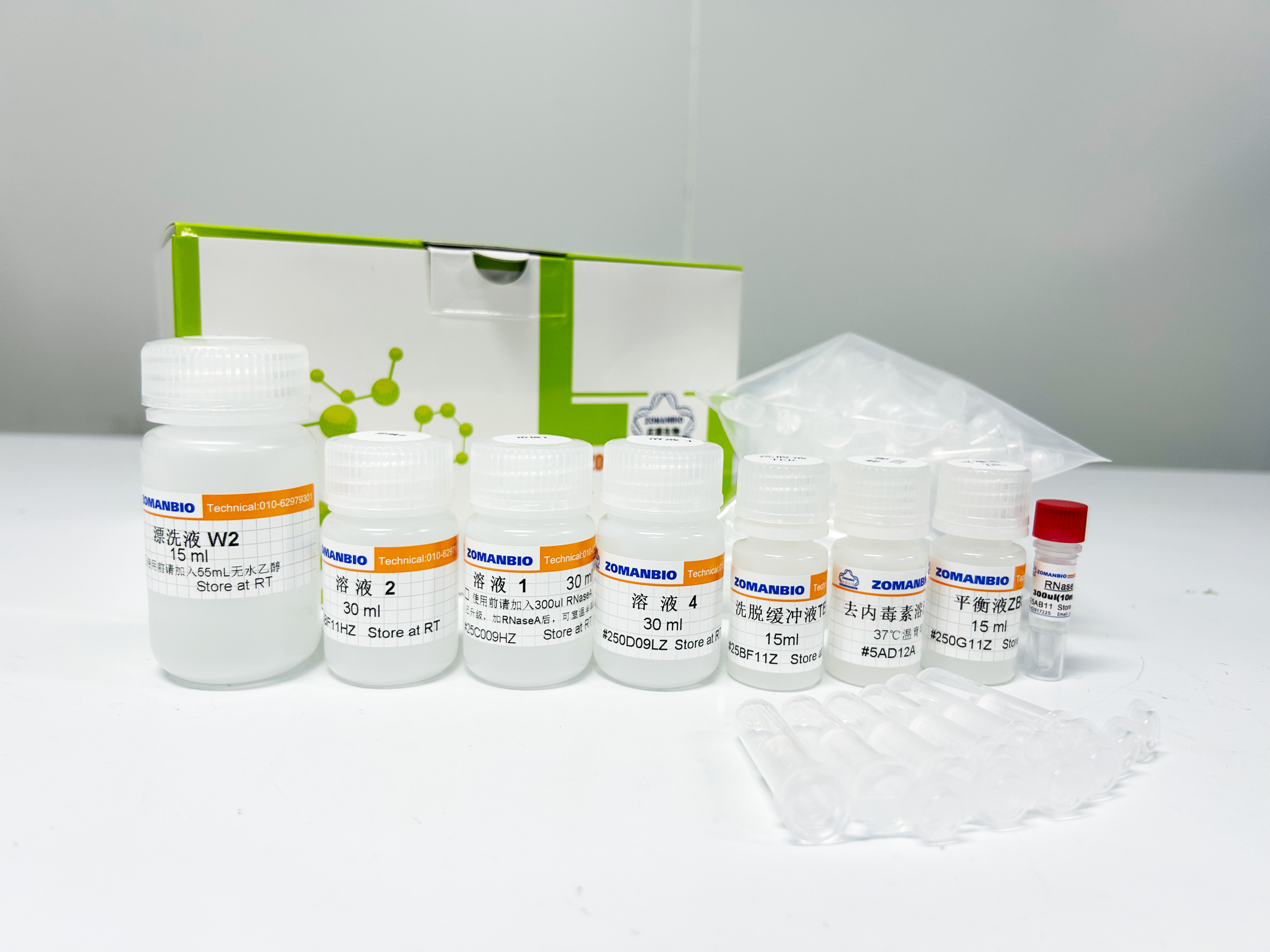 本试剂盒采用碱裂解法裂解细胞,通过离心吸附柱在高盐状态下特异性地结合溶液中的质粒DNA。离心吸附柱中采用的硅基质材料为本公司特有新型材料,可高效、专一吸附DNA,同时采用特殊的溶液4和去内毒素溶液,可有效的去除内毒素、蛋白等杂质。本试剂盒可从5-25 ml大肠杆菌LB (Luria-Bertani) 培养液中,快速提取多至100 μg高纯度的高拷贝质粒DNA,提取率达85-90 %。